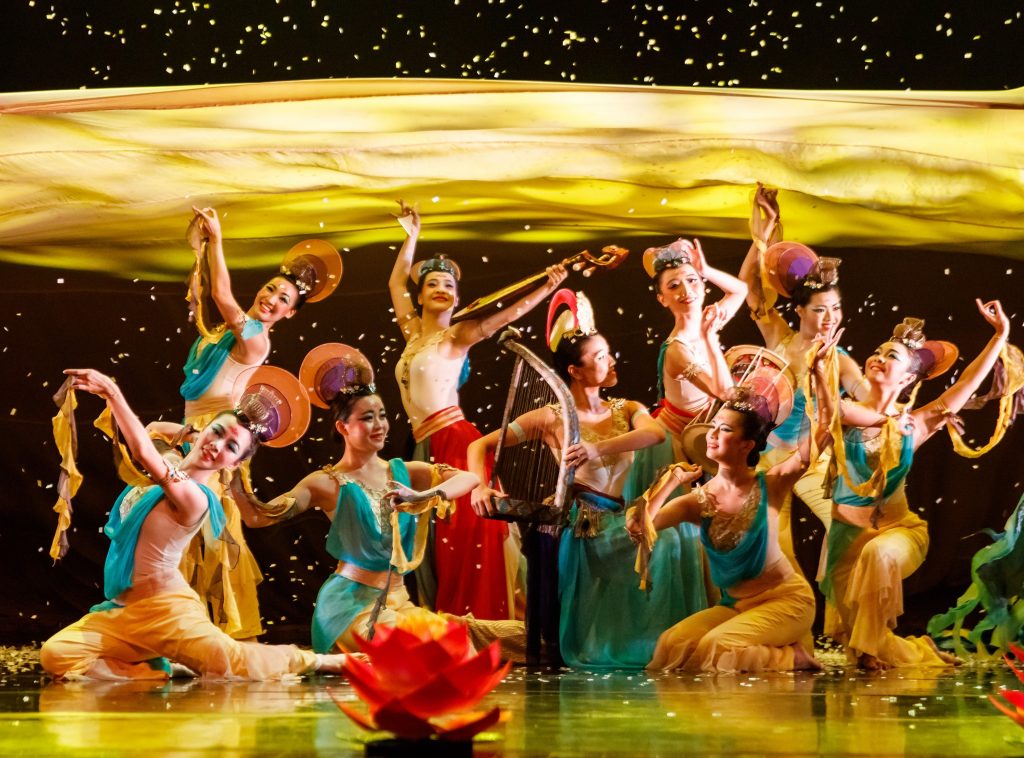 Postures of “apsaras (celestial maidens) playing musical instruments” and “playing the pipa behind the back” that appear in the realm of Dunhuang are presented in front of the audience through the dance, dancers’ bodies and countenances, fusing with stage effects and flamboyant costumes. All these combine to achieve a grand dancing poetry that emphasizes both aesthetics and visual pleasure. While the audience will be amused by the fusion of present and past derived from the aesthetics of Dunhuang, they will also share with the dancers a philosophical inspiration about life.